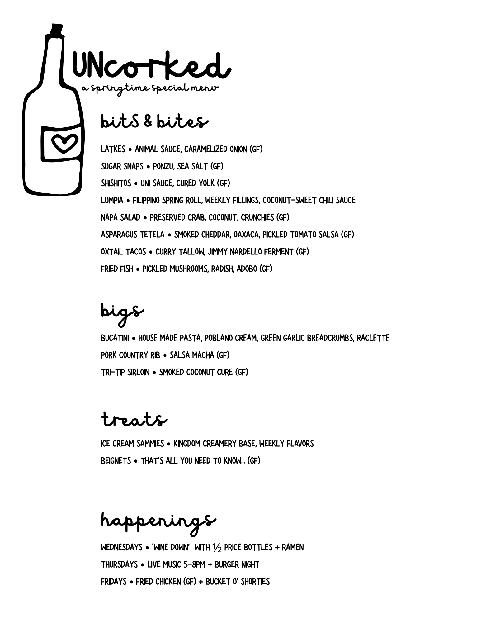 UNCORKED is our way of loosening things up for the season with a limited-time dinner format — leaning into food that feels both familiar and fun, while staying rooted in the quality and intention that define Cork.